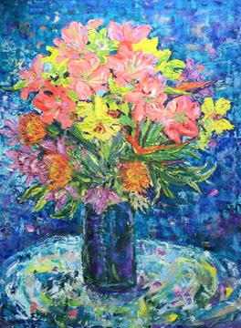 Amaryllis, Orchids and Bird-of-Paradise, 40x30", oil and acrylic on canvas
